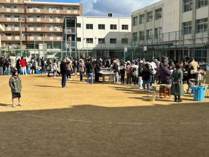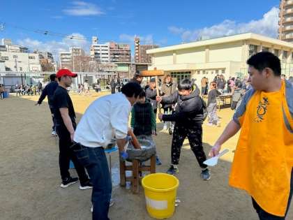 三先地域活動協議会の方々を中心に盛大に「お餅つき」が行われました。昨年は、コロナ明けで子どもたちに限定していましたが、今年は、たくさんの大人の人も参加し、とても盛り上がりました。子どもたちもたくさん参加し、つきたてのお餅や豚汁、たこ焼きをいただき、笑顔がいっぱいでした。お餅を搗いたり、丸めたりする様子に興味を持ち、体験した子どもたちもたくさんおり、地域の方とふれあいができた本当に楽しい一日となりました。
