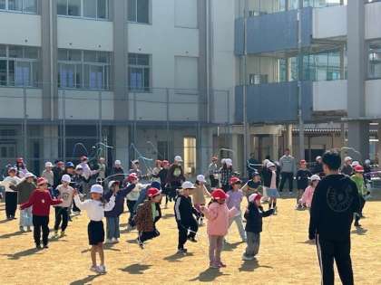 寒い毎日の中でも、元気に身体を動かすため、1月は休み時間に縄跳び運動を行っています。低学年と高学年に分かれて、音楽のリズムに合わせて、いろんな跳び方や動きに挑戦します。楽しみながらチャレンジできる取り組みです。