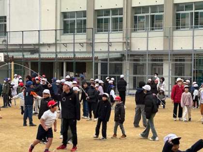 縄跳び運動は、縦割り班でも楽しんでいます。高学年が回してくれる縄に合わせて、低・中学年が入っていきます。教えあったり励ましあったりして楽しんでいます。
