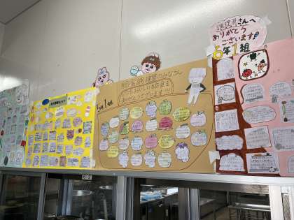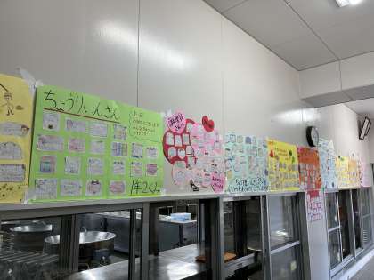 給食室には、調理員さんが子どもたちから受け取ったお手紙を掲示してくださっていました。どのクラスも調理員さんへの感謝の気持ちや好きなメニューなどを記していました。これからも残さずに食べ、健康な体を作りましょう。