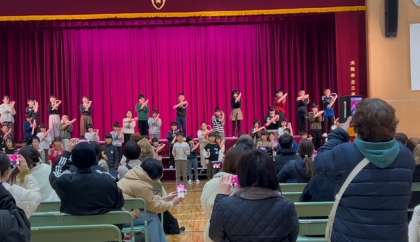 2年生は、楽しいリズムと音楽に乗って発表が進んでいきました。子どもたちはノリノリで、算数の九九や国語の早口言葉を言ったり、美しい音色で演奏したりしました。最後はみんなで「歌えバンバン」を思い切り歌いました。