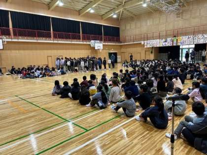 1〜5年生が見守る中6年生が入場し、1年生が代表して、縦割り班グループでお世話になった6年生にグループ写真をプレゼントしました。