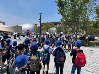 5年生は大阪市より割り当てのあった大阪ヘルスケアパビリオンの見学をしたり、マレーシアのパビリオンや水上ショーを楽しんだりしました。子どもたちは食い入るように展示物を眺めていました。気候が良かったのでお弁当は大屋根リングの下で食べることができました。これらの経験が、自分たちの未来の糧に少しでもなってくれればと期待しています。