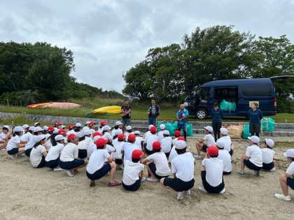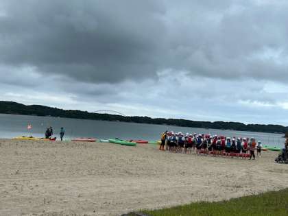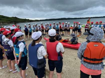 浜辺でインストラクターさんに出会い、丁寧に乗り方や漕ぎ方を教えてもらいました。いよいよ出発です!ドキドキしながら漕ぎ出しました。2人で声を合わせて頑張りましょう!
