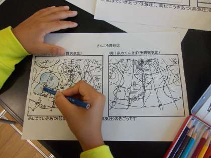 気象予報士の仕事、西から東に動く1年間の雲の動き(動画)、天気図の見方、天気予報ができるまで、天気予報に挑戦、などについて学習しました。