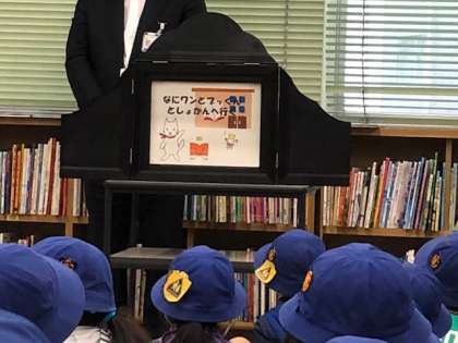 図書館では、さざなみ会の絵本の朗読や図書館についての紙芝居を聞いたり、図書館の中をタブレットで写真を撮ったりして図書館のことについて学習しました。
