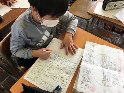 国語科の「ゆめのロボット」をつくる、の学習で、自分の考えた夢のロボットを説明文にまとめました。また、自身で作成した思考ツールを活用しながら、新聞づくりにも取り組んでいます。