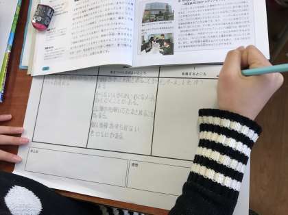 5年生は社会科「くらしを支える情報」の単元で、情報やメディア、情報ネットワークの役割について学習しました。本単元の学習ではタブレットを使って、実際に情報ネットワークのページにアクセスしたり、グループの意見をまとめたりしました。そして、インターネットの便利な点と注意する点をまとめ、利用する際の注意点について、学級で意見交流をしました。交流から子ども達は、インターネットを快適に利用するには、使い手側の注意が必要であることに気づきました。本単元の学習を通して、メディア・リテラシーや情報モラルの必要性について気づくことができました。