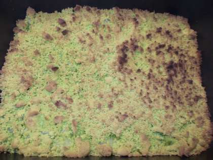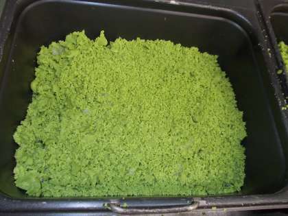 和なしのまっ茶クランブルは、和なしのカット缶の上に、まっ茶を加えたビスケットのような生地を細かくしながらふり入れて焼き上げています。