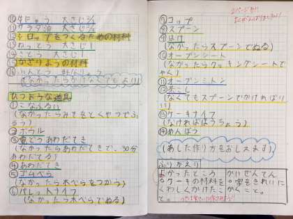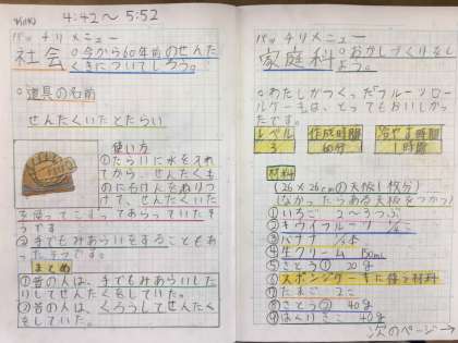 左のページは「ばっちりメニュー(国語・算数・理科・社会等の教科)」、右のページは「ワクワクメニュー(自分の調べたいこと、興味・関心のあることなど)」、学習した時間、振り返りも記入しています。
