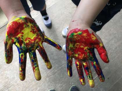 友だちの手に絵具を塗ってあげたり、友だちの手を支えたりしながら楽しく活動に取り組みました。片づけも最後まで協力してできました。