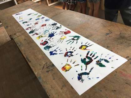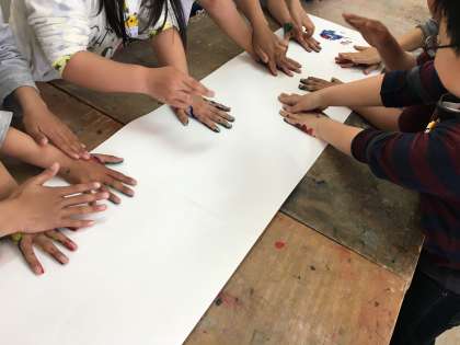 学年開きを行いました。4年1組、2組の児童全員が集まって、図工室で手のひらスタンプをしました。