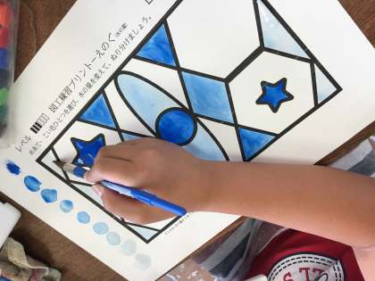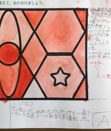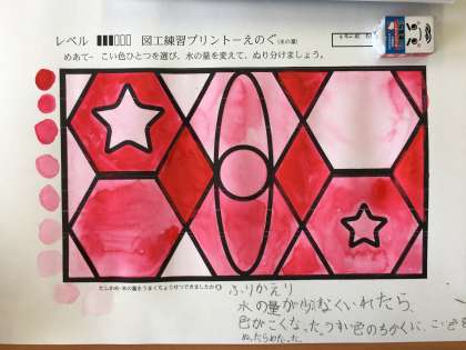 絵具を使った学習をしました。今日は、使える色は1色です。絵具の量、水の量を変えて、濃い色や薄い色を作りました。使える色は1色でも、色の濃さを変えるだけでもきれいにぬれることを知りました。ぬり方ひとつで美しく見えるということに気付いた児童もいました。また、互いの作品を鑑賞し、友だちの作品のよい所もたくさん見つけました。
