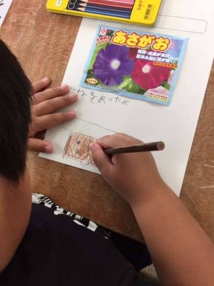 昨日のあさがおのたねまきの様子を、「生活科カード」に書きました。毎日水やりを忘れないようにしましょうね。どんな花がさくのかな?