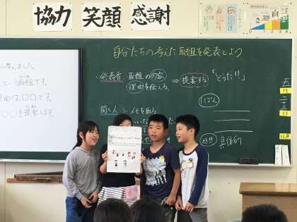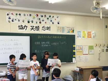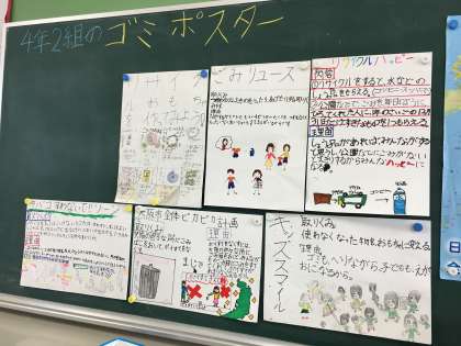 社会科の「住みよいくらしとごみ」の学習のまとめをしました。ごみを減らす取り組みをグループで考え、ポスターにまとめ発表しました。取組例として、リサイクルをすると水等の商品をもらえる「リサイクルハッピー」、不要なものを活用しておもちゃをつくる「リサイクルおもちゃ」、ポイ捨てをなくすために、大阪市中にごみ箱を置く「大阪市全体ピカピカ計画」「キッズスマイル」等たくさんありました。