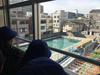 先日、教室で子どもたちの様子を見ていると、窓の近くに集まって外を覗き込んでいました。何かな?と思って、見てみると、プールに2羽のカモ?がいました。