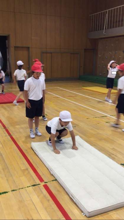 体育の授業でマット運動を行いました。これまでの学習で、前転、開脚前転、後転、側転を行いました。