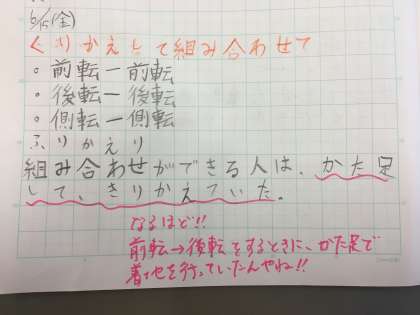 今日は、技を「つづけて」「組み合わせて」行いました。前転⇒前転、後転⇒後転などはスムーズに行えました。しかし、前転⇒後転となると体の向きが変わるのでスムーズにいきません。どうしたらスムーズに行えるかを考えました。子どもたちは、友だちの動きを見たり、考えたりしながら試行錯誤して運動に取り組みました。
