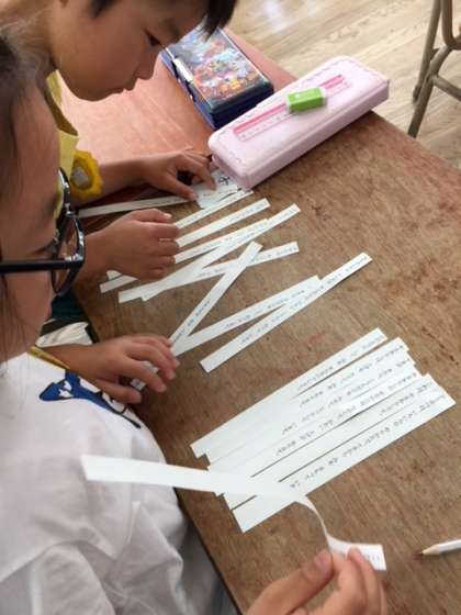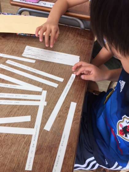初めての説明文の学習です。事柄の順序に気をつけて、内容を正しく読むことがねらいです。ばらばらになった文章を、並べ替える学習をペアで行いました。