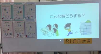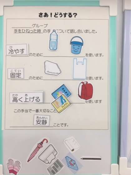 発育測定前の保健のお話しでは地震が起こって救急セットが近くにない場合、身の回りにあるものを使って応急手当が出来るということを学びました。グループになって話し合い様々な考えを発表することができました。