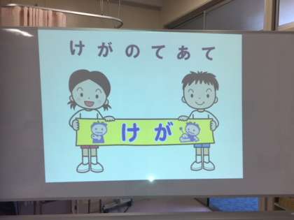 擦り傷や鼻血、やけどをしたときにまず一番初めに何をするのか手当の仕方を学びました。