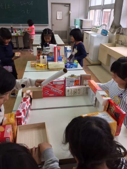 今日は、いろいろな箱を並べたり、積んだりしながら造形活動を楽しみました。高く積んだり、並べてお家を作ったりしました。