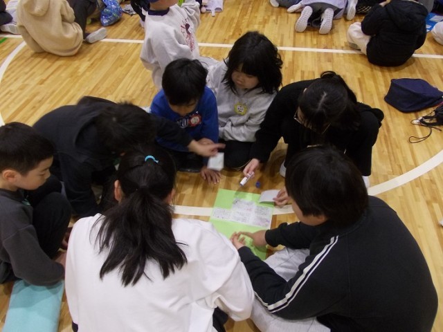 朝の時間にたてわり班で集まって、6年生にメッセージボードを作成しました。