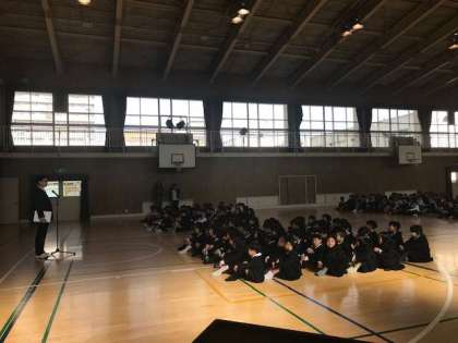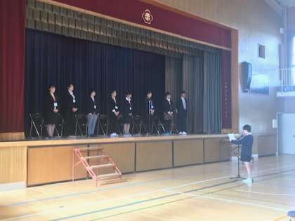 今年度、田中小学校に来られた教職員のかたの着任式と一学期の始業式が行われました。児童の代表の歓迎の言葉のあと、新しく来られた教職員のかたの挨拶がありました。そのあと、始業式では、新しい担任の先生の発表があり、最後にみんなで校歌を歌いました。