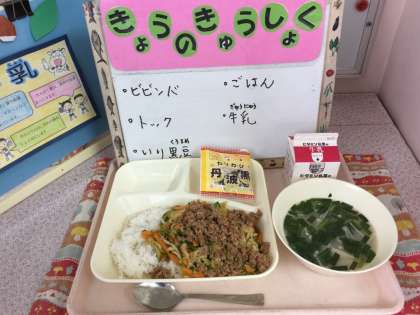 今回の給食では、ひき肉、切り干しだいこん、きゅうりなどを使っています。