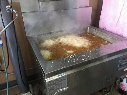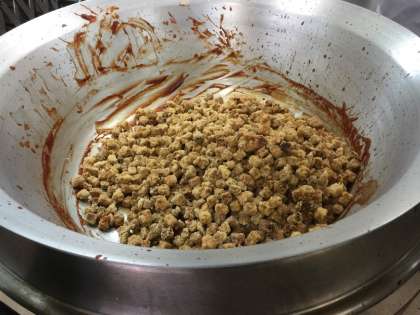 3)ケチャップ、砂糖、赤みそを煮て作ったたれを、からめます。