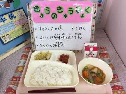 まぐろのオーロラ煮、じゃがいもと野菜の含め煮、キャベツの梅風味、ごはん、牛乳