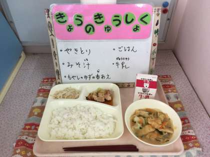 焼きとり、みそ汁、もやしのゆずの香あえ、ごはん、牛乳