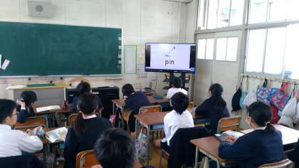 田中小学校では、水曜日の昼休み終了後に外国語のモジュール学習をしています。英語の音楽や映像に合わせて、英語の発音に慣れ親しんでいます。