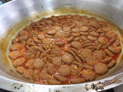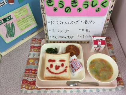 煮こみハンバーグ、コーンスープ、さんどまめのサラダ、食パン、いちごジャム、牛乳