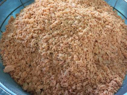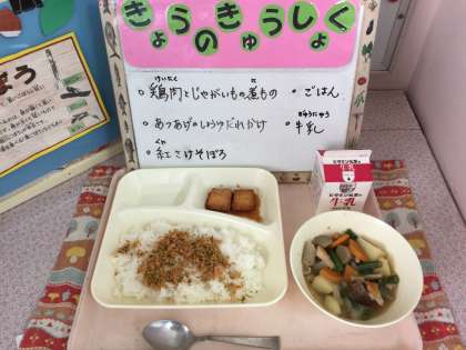 鶏肉とじゃがいもの煮もの、あつあげのしょうゆだれかけ、紅ざけそぼろ、ごはん、牛乳