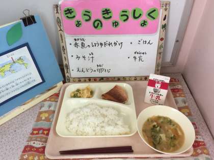 あかうおのしょうゆだれかけ、えんどうの卵とじ、みそ汁、ごはん、牛乳