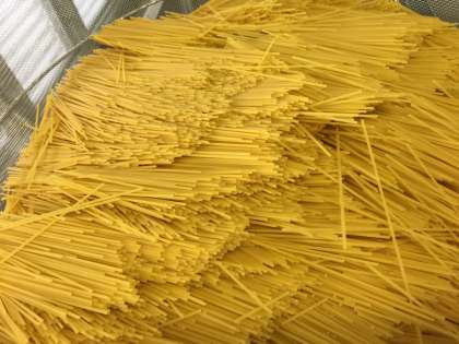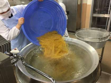 カレースパゲッティ、バナナ、キャベツのひじきドレッシング、黒糖ロールパン、牛乳