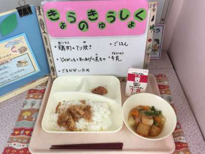鶏肉のてり焼き、じゃがいもとあつあげの煮もの、ごまかかいため、ごはん、牛乳