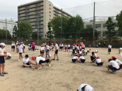 1時間目は、八幡屋公園の多目的グランドで運動会の全体練習を行いました。練習が終わったあとには、みんなでグランドの石拾いをしました。
