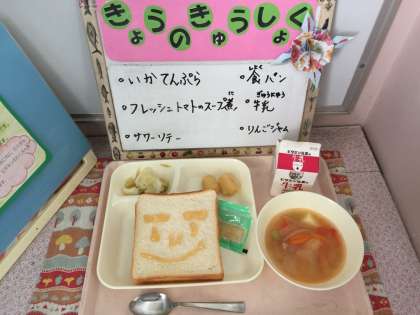 いかてんぷら、フレッシュトマトのスープ煮、サワーソテー、食パン、リンゴジャム