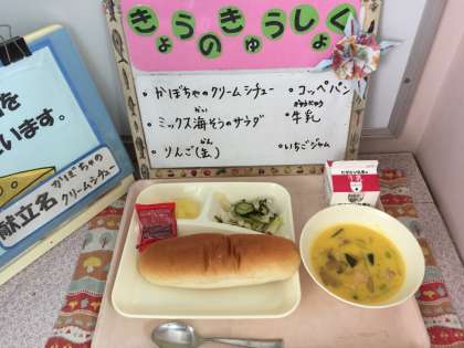 かぼちゃのクリームシチュー、ミックス海そうのサラダ、りんご(カット缶)、コッペパン、いちごジャム、牛乳