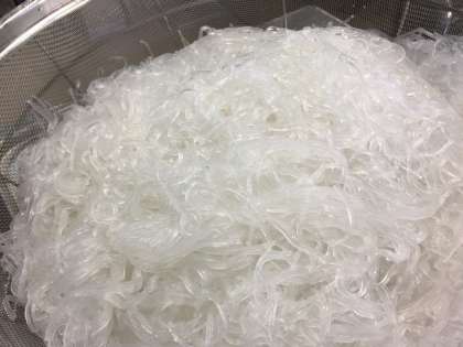 給食で使われている「はるさめ」は、さつまいもやじゃがいものでんぷんから作られています。緑豆から作られる中国の「緑豆はるさめ」にくらべて、太く、もちもちとした食感です。