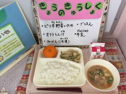 ピリ辛野菜いため、オクラとん汁、みかん(冷)、ごはん、牛乳