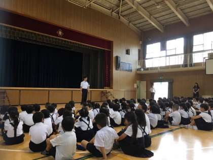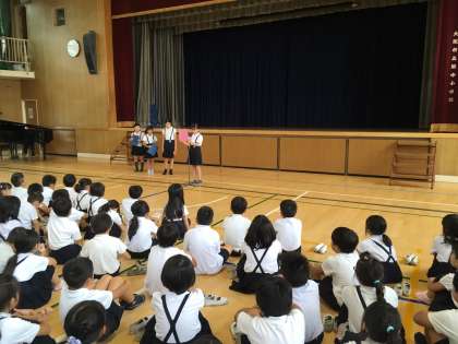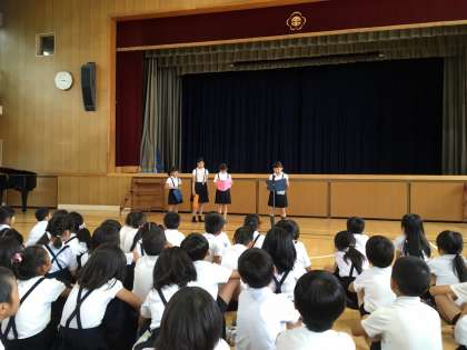 校長先生から夏休みの過ごしかたのお話があった後、3年生と6年生の代表の児童が1学期の思い出についての作文を発表しました。