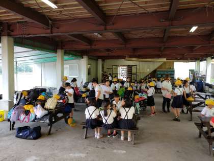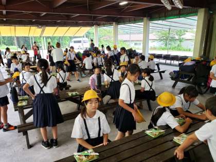暑いので、日陰で昼食をとります。バス酔いした児童はいますが、みんな楽しそうです!