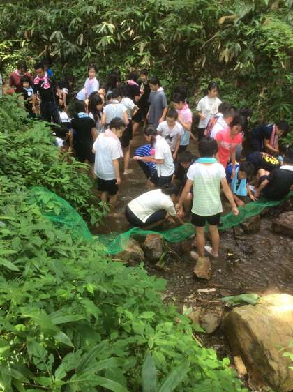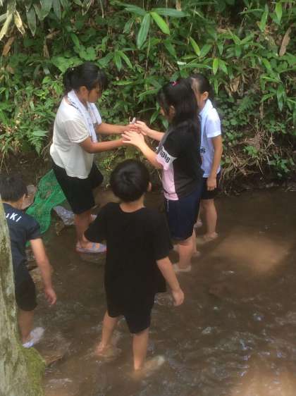 魚つかみ、ニジマスを手でつかまえます。逃げて岩陰に隠れようとする魚を追いますが、なかなかつかまえられません。