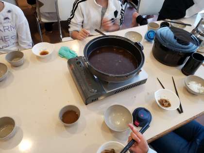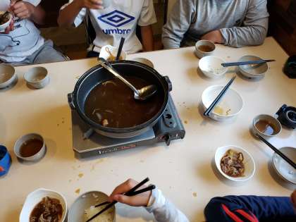 ご飯を食べすぎて、まだすき焼きが残っている班もありますが、完食した班も出てきました。