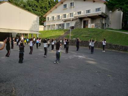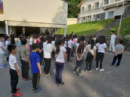 三日目朝会です。「まだ寝たい人?」の問いかけに、ほぼ全員手を挙げていました。