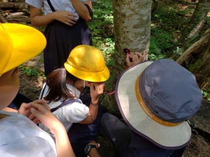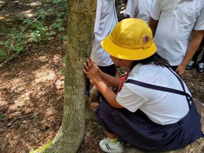 次は聴診器で、木の音を聞きます。目を閉じて、意識を耳に集中させて!