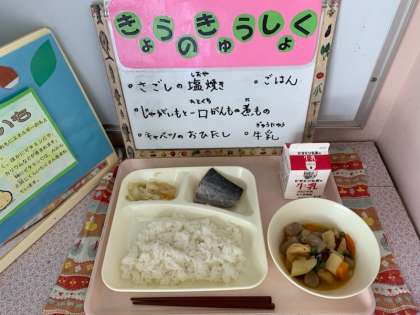 さごしの塩焼き、じゃがいもと一口がんもの煮もの、キャベツのおひたし、ごはん、牛乳